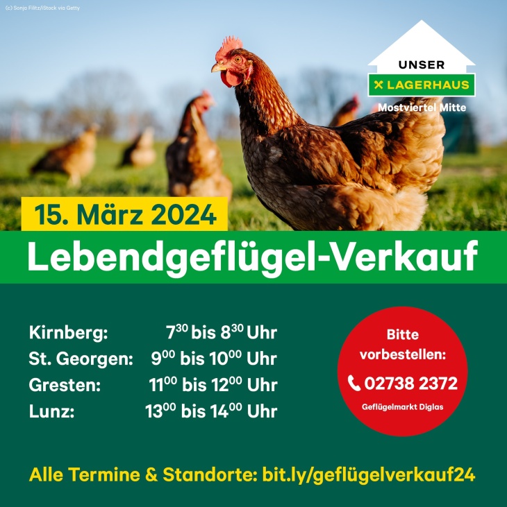 NEU im Lagerhaus Mostviertel Mitte: Ab sofort kannst du an 9 unserer Standorte 1x im Monat Lebendgeflügel vom Geflügelmarkt Diglas erwerben.