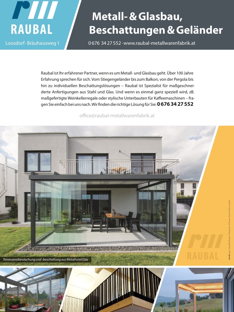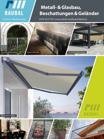 Gründungsjahr 1911. Über 100 Jahre sprechen für sich, wenn es um Metall-&Glasbau; Beschattungen & Geländer geht.Vom Stiegen- u. Balkongeländer von Pergola u. Markisen bis hin zu individuellen Beschattungslösungen. Das Team der Raubal GmbH ist Spezialist für maßgeschneiderte Anfertigungen aus Stahl-, Glaselementen u. Schiebetüren- in Verbindung mit Holz oder anderen Materialien sowie Hochwasserschutz aus Aluminium von Prefa. Und wenn es einmal ganz speziell wird, zB. maßgefertigte Weinkellerregale oder stylische Unterbauten f. Kaffeemaschinen - fragen Sie bitte einfach nach.Raubal GmbH findet die richtige Lösung.Planung-, Fertigung- und Ausführung - alles aus einer Hand!